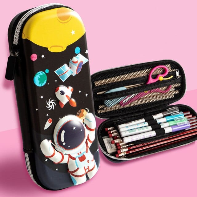 Voilà une trousse rigide en forme ovale qui s’ouvre par le milieu avec une fermeture éclair. A l’intérieur, on y trouve des rangements pour y attacher les feutres et stylos. La décoration sur le thème de l’espace sur le couvercle est en relief, et la trousse est résistante aux petites projections d’eau.