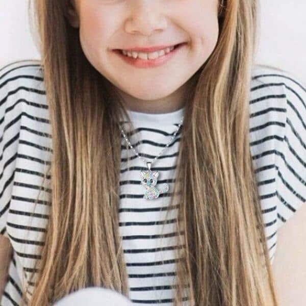 Votre fille sera magnifique avec ce collier avec pendentif chat. Un joli collier fabriqué en alliage de zinc et strass en verre qui la séduira par sa brillance, son originalité ainsi que son charme exceptionnel. Ce bijou se fera remarquer sur le cou de votre petite princesse.