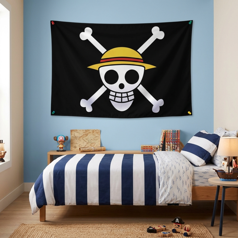 Ce drapeau One Piece pavillon pirate hisse les couleurs de l’équipage légendaire de Luffy ! Jolly Roger emblématique sur fond noir, chapeau de paille jaune reconnaissable instantanément : votre enfant affiche son appartenance aux Mugiwaras. Parfait pour décorer sa chambre et affirmer sa passion pour l’aventure !