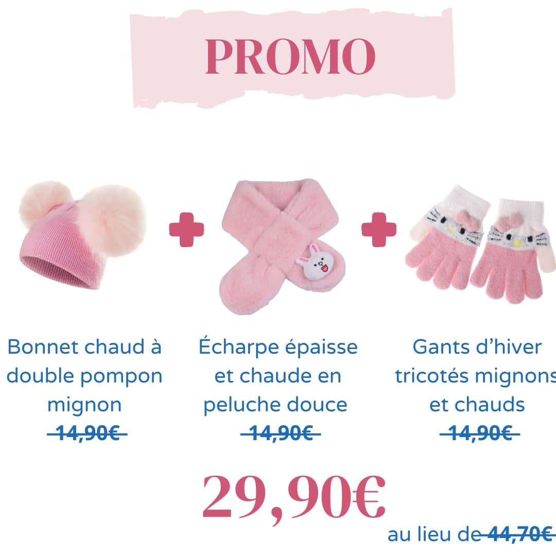 -33%Protégez votre petite fille du froid avec notre pack spécial hiver pour les petites filles ! Composé d’une écharpe épaisse et chaude en peluche, d’une paire de gants en laine et d’un bonnet chaud à double pompon trop mignon, votre petite fille pourra affronter l’hiver sereinement.
